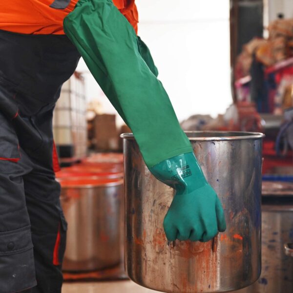 - PPE Work Gloves Extra-long sleeve 26 inch’s (66cm) to shoulder length, long enough to cover all your arm length. Elastic cuffs makes it stick to your arm, no falling off. Ideal for handling chemicals, petrochemical and oil refining, mechanical manufacturing, mining, agriculture, gardening, construction, automotive industry, farm, forestry, fish tank, aquarium, pod, garden, yard, bathroom, car wash, auto maintain, swimming pool, range hood clean etc.
